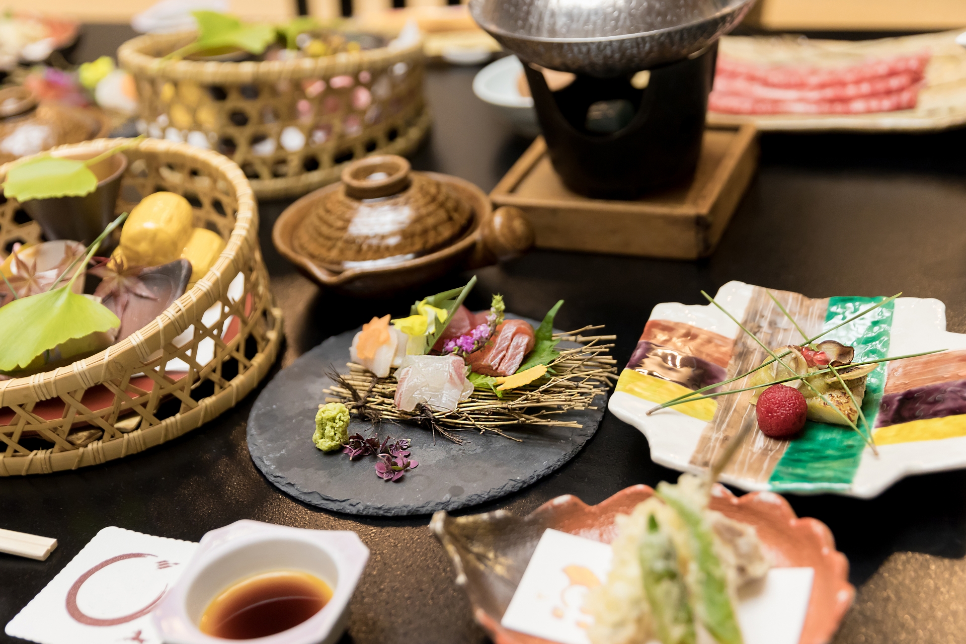 炊きたての白米、焼き魚、鍋物、出汁巻き玉子、小鉢など数品。